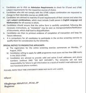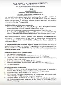 ADEKUNLE AJASIN UNIVERSITY, AKUNGBA-AKOKO [AAUA] RELEASES UTME/DE ADMISSION SCREENING EXERCISE FORM FOR THE 2023/2024 ACADEMIC SESSION