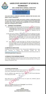 This is to notify the general public, particularly candidates seeking admission into the Lagos State University of Science and Technology, Ikorodu in the 2023/2024 academic session of the commencement and guidelines for the post-UTME online admission screening exercise as follows: