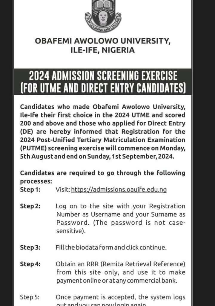 OBAFEMI AWOLOWO UNIVERSITY, ILE-IFE BEGINS THE SALES OF POST UTME/DIRECT ENTRY ADMISSION FORM FOR THE 2024/2025 ACADEMIC SESSION